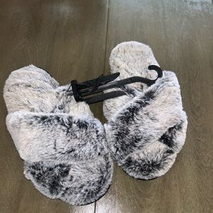 Step into comfort with these cozy gray faux fur slippers. Perfect for lounging at home, these slippers offer warmth and style.