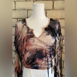 This is a distressed mesh long-sleeve crop top with a tye-dye pattern. Size small