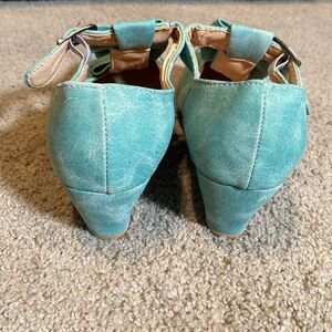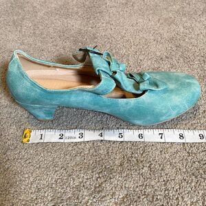 Women’s Shoes with Bows and Buckle Closure. Round Toe and Low heel. The material is suede like on these shoes with a distressed look. Reminiscent of a vintage shoe style. Sole is rubber. You can see from the soles these shoes are brand new!