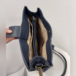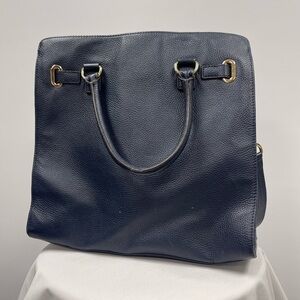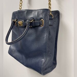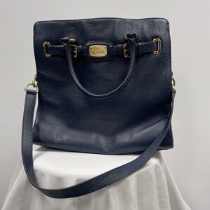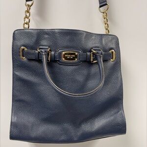 Blue leather large sized Hamilton MK bag. 14x14 inches. Gold hardware. Has handles and crossbody strap.