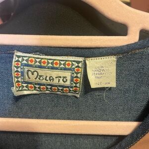 AMAZING vintage 70s 80s Molato denim dress with shell and abstract female face design. This is so so cool. I wish it fit me! Tag Size medium. Very good vintage condition. Some wear throughout and to face design (see photos) but still tons of life left. These can get pretty expensive and rare. Buttons all the way down the side.