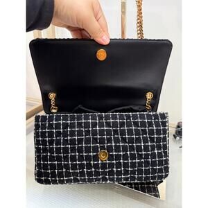 Unused flap bag with gold hardware, leather mixed, large size retail 2550