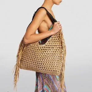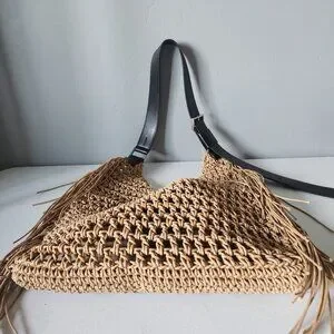 "LIKE NEW" Fantastic Looking Large Cotton Crochet Sabine Hobo By All Saints. Heavy Duty Cotton ( Natural in Color) with Smooth Black Adjustable Leather Shoulder Strap, Logo Embossed Leather & Silver-tone Hardware, Clean Tan Canvas Attached Interior/ Liner with Snap Closure, Knotted/Crochet Look with Side Fringe Accents, Bag Measures approx. 11" T X 16" W, "Like New, No Wearing/Stains, Used Once:) Rt.350.00 approx. * Perfect Beach/Vacation/ Summer Pack-able Bag!