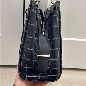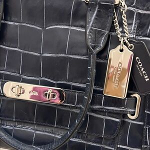 Sophisticated Coach satchel in navy croc-embossed leather. Features elegant silver hardware and a chic design.