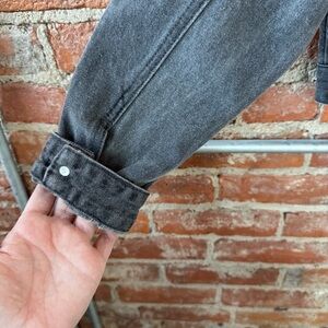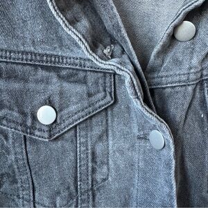Stylish dark gray denim jacket. Features button closures and front pockets. Classic collar design.