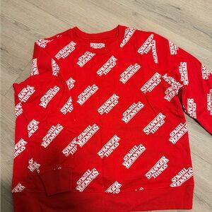 Cozy up in this vibrant red Stranger Things sweater. Perfect for fans, it combines comfort with style.