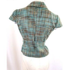 Stylish cropped plaid blazer with short sleeves. Features a belted waist for a tailored fit. Perfect for professional or casual wear.