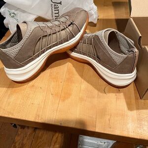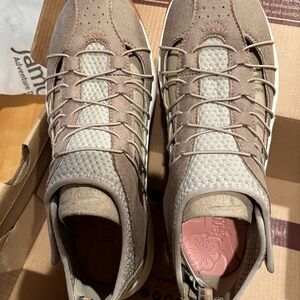 Stylish taupe sneakers with unique lace design. Comfortable and versatile for any occasion. These shoes are brand new and never worn. These shoes have been approved by doctors for quality, safety and effectiveness in allowing for normal foot function and promoting good health.