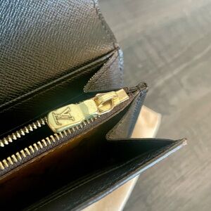EUC LV monogram and giant reverse monogram Sarah wallet. No callouts on exterior and interior. Minor tarnishing on zipper pull