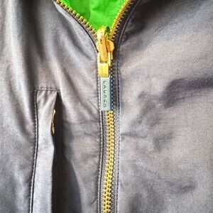 Features a full zip front with branded Lauren zipper pull, adjustable waist drawcord, flap pockets with brass snaps, and a structured stand collar. Fully reversible for two distinct looks in one versatile layer.