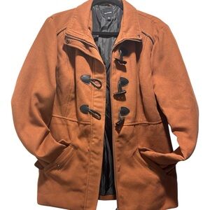Stylish rust trench coat by Rampage. Features unique toggle closures. Perfect for layering.
