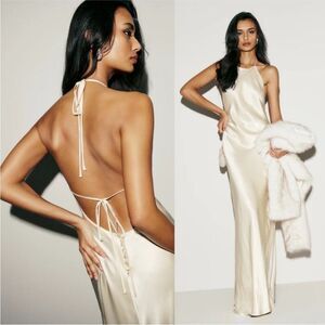 adjustable straps, open back and tie detailing, sleeveless, halter neckline, fitted bodice, lined, long floor length maxi skirt, multiple button center back closure.
