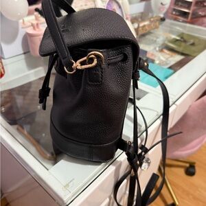 Chic black leather backpack with pebbled texture. Features iconic Tory Burch logo. Stylish and practical for everyday use. Button where it strapped loos used and scratched. Everything else is in good condition.