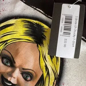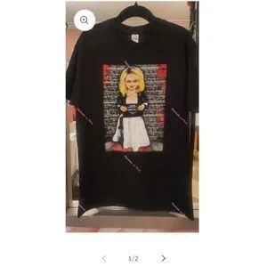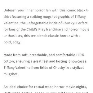 Black t-shirt featuring a Tiffany Valentine graphic. Perfect for horror fans. Unleash your inner horror fan with this iconic black t-shirt featuring a striking mugshot graphic of Tiffany Valentine, the unforgettable Bride of Chucky! Perfect for fans of the Child's Play franchise and horror movie enthusiasts, this tee blends classic horror with a bold, edgy.