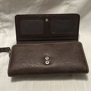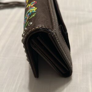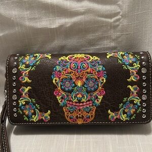Gently used leather wristlet. Embroidered sugar skull on front of wallet; back of wallet has a zipper compartment. Wrist strap is removable. Inside of wallet has 3 clear id slots with an additional 11 card slots and 3 larger slots for cash. Slight flaws as noted in photos. This item may be combined with my matching Montana West concealed carry purse for discounted shipping.