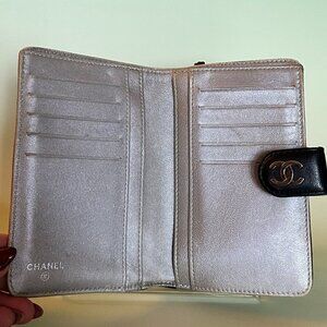 Soft, black leather exterior with silver interior. Has 10 card slots and a separate zippered coin section.