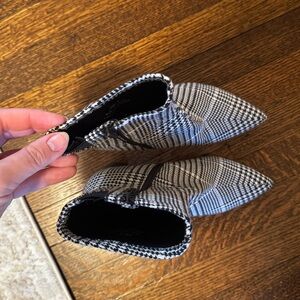 Step out in style with these striking checkered boots. Features a bold pattern and sleek heel. Great condition!