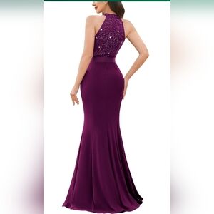 Elegant halter V-neck formal maxi dress featuring a lace sequin bodice and a flowing pleated skirt. Flattering, timeless silhouette that works beautifully for formal events and special occasions.
