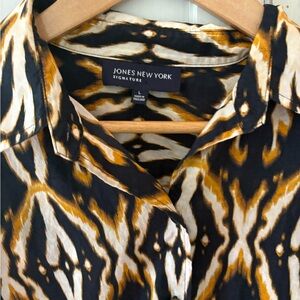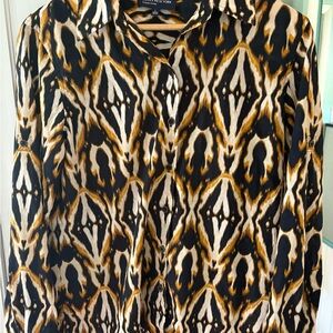 Chic blouse with an abstract design. Features black, brown, and cream hues. Perfect for stylish outings.