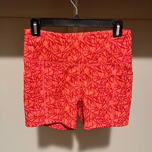 Vibrant orange & red shorts with geometric design. Ideal for workouts and casual wear. These shorts have a pocket for everything you will ever need on a run!