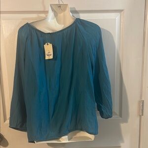 Chic blue blouse with tie front and ruffle accents. Ideal for versatile styling.