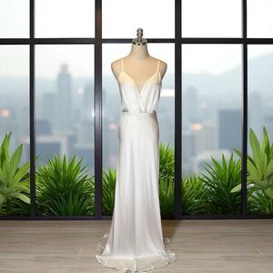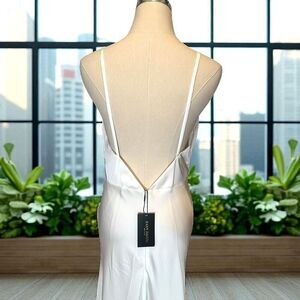 ramy brook, vick gown, satin gown, ivory dress, white gown, evening dress, formal gown, wedding guest dress, bridesmaid dress, rehearsal dinner dress, bridal shower dress, prom dress, gala dress, red carpet style, special occasion dress, luxury dress, designer gown, size 6 dress, long dress, floor length gown, v neck dress, open back dress, strappy gown, slit dress, elegant gown, cocktail attire, black tie dress, resort wear, new with tags, bachelorette, reception, black tie, holiday party, NYE, new years, revolve