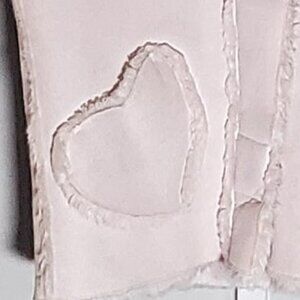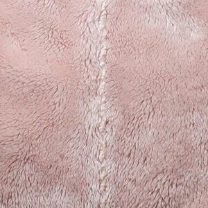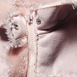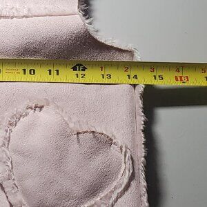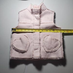 this is a pink faux suede zip and snap front vest with front heart shaped pockets - vest lined with faux fur - see all pics for measurements - suede is 100% poly and fur is 76acrylic/24poly - machine washable - used and in great condition with no issues - Made in China and weighs 10.3ozs