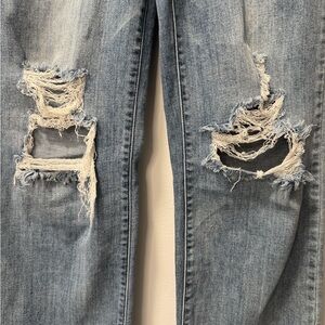 Trendy light blue jeans with a straight leg cut. Features stylish distressed details. Perfect for casual wear.