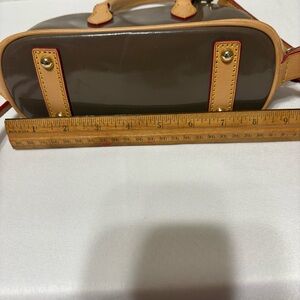 Dooney & Bourke Patent Leather Domed Satchel (also known as the Zip Zip Satchel) in brown with natural Vachetta leather trim. It features a glossy, high-shine finish, gold-plated hardware, and a zip-around closure.