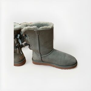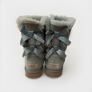 These beautiful women's UGG Australia Bailey Bow boots in a breathtaking, Sage green come in a women's size 8. It is a muted medium pastel green, really beautiful color. They are no longer made in this color and style! They are in good condition with some normal wear. The suede is slightly stiff. There are no tags, but they are a size 8. The shearling suede fabric and wool insole will keep your feet comfortable, warm and cozy, while you rock your show stopping boots! They are perfect for any occasion, from casual around town, holidays, school, or fun at a festival. These boots are adorned with a charming double bow accent lining the heel and lined with soft sheepskin. The rubber insole material ensures durability and traction, making them suitable for outdoor or indoor adventures. They are a range from dopamine, pastel, feminine, Christmas, Mob Wife, clubwear, girl-core, Lana Del Rey, coquette, Ballet-core, boho, Malibu chic, or festival vibes.