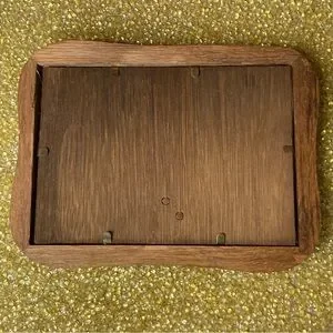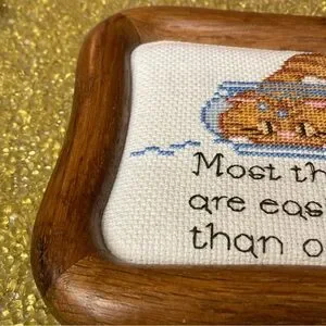 Charming cat embroidery art in a wooden frame. Features a playful cat design with a humorous quote. Some staining near the cat’s tail. Kitschy and cute.