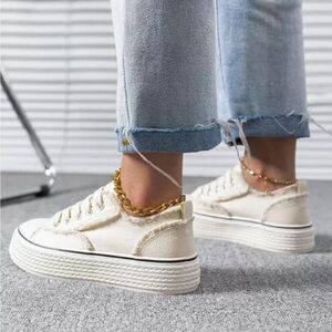 Step out in style with these chic cream canvas sneakers. Perfect for casual outings, these shoes offer both comfort and fashion. Has slight platform. Size 8.