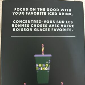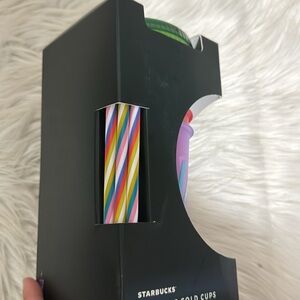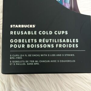 NEW IN BOX. STARBUCKS 5 REUSABLE MULTICOLOR CUPS, LIDS&STRAWS. POSITIVE SAYINGS
