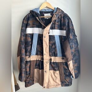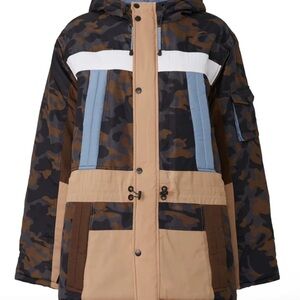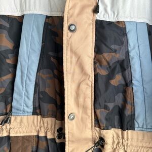 Multi Color and camouflage nylon (100% Polyester). Ski coat. Long sleeves. Front zipper closure. 32" from shoulder to hemline. Imported.