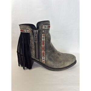 Corral Women’s Black Leather Ankle Boots J-Toe Fringe & Aztec Embroidery Size 10