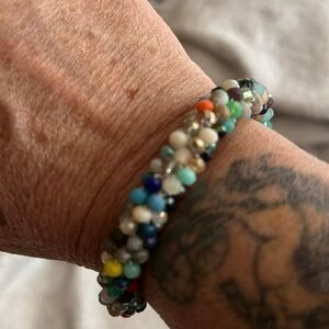 White And Gray Faceted Hypoallergenic Nickel Free Beaded Stretch Bracelet. Custom Glass Glass Beads Accents And Designed With Love In Texas. Size Medium, 7 inches. Add a splash of color to your outfit with this vibrant multicolor beaded bracelet. Perfect for any occasion.