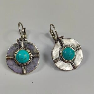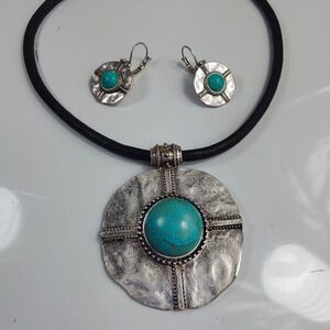 Adorn yourself with the captivating allure of this turquoise pendant necklace and earring set. The substantial silver-tone pendant, centered with a vibrant turquoise stone, evokes a sense of ancient artistry and natural beauty. Paired with matching dangle earrings, this set adds a touch of bohemian spirit and southwestern charm to any ensemble. Perfect for a music festival, a casual day out, or adding a unique statement to your everyday wear.