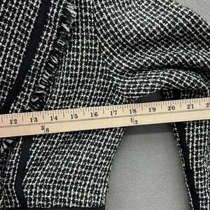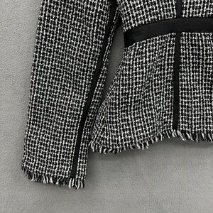 Sophisticated distressed tweed blazer from True Meaning with black ribbon detailing, matching button closure and cuff slits. Very cool unique design and a very flattering fit.