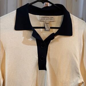 Excellent condition, soft, stretch , lightweight, ribbed, collared neckline with 3 black buttons, drop shoulder style, classic, timeless chic