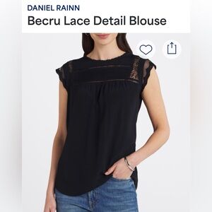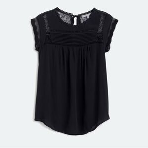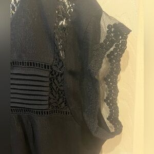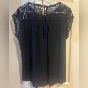 Add instant elegance to your wardrobe. Wear this breezy blouse with trousers, heels and jewelry for a night out or dress it down with jeans and flats. Flutter cape lace sleeves. Curved hem. Crew neckline. Tie back. Perfect for versatile styling. 100% Rayon. Dry Clean. Original purchase from Stitch Fix.