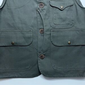 Vintage C.C. Filson Canvas Vest Mens Size Medium Olive Green Hunting Fishing Cargo Made in USA. Pockets front and back. One huge pocket in front. Measures 20” across front and 25” long. Mint Condition