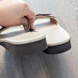 Natural beige bos taurus and leather Aglaia slides from Ancient Greek Sandals featuring an open toe, a buckle fastening, a branded insole and a flat sole.