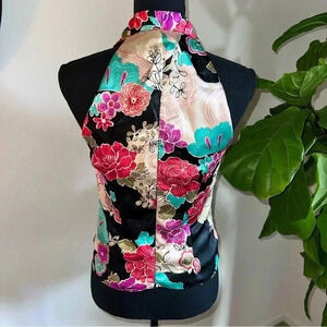 Joseph Ribkoff Trends Women’s Oriental Print Pleated Lined, Halter V-Neck Top Size 8. Pullover, zip closure in excellent condition. Beautiful, bright, shiny material. ***Styled on a size 4 mannequin***Black blazer sold separately***
