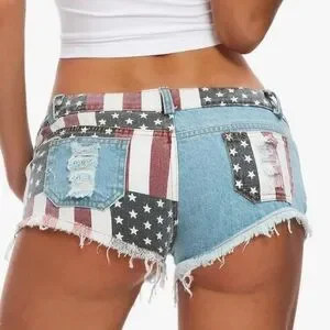 Very cheeky American flag short shorts. Distressed ends. Button closure with zipper fly.