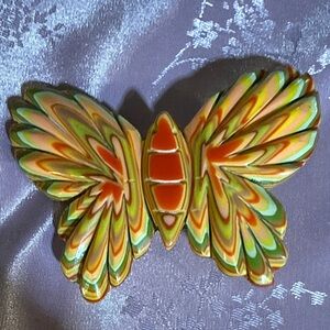 Vibrant butterfly brooch with orange, green, and yellow hues. Perfect for adding a pop of color to any outfit.
