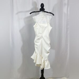 The Lilith dress from Cinq à Sept features a fitted, ruched bodice with a straight neck and spaghetti straps. An asymmetric ruffled hem finishes this mini-length style.