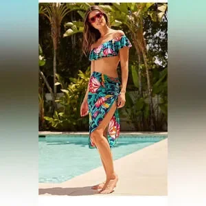 Printed design, ruffle trim, bandeau style top, fabric provides