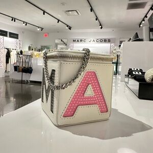 Chic mini bag by Marc Jacobs. Features bold pink and white design. Silver chain adds elegance.