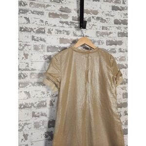 The 2B Rych Dress in size 4 is a metallic gold sparkle dress with edgy zipper pockets, perfect for a party or cocktail occasion. Made from a linen blend, this short sleeve dress features a scoop neckline and a pullover closure. The dress is accented with glitter details, giving it a glamorous touch. The mini dress length and solid gold color make it a standout choice for any season, whether it's winter, summer, fall, or spring. With its unique design and brand, 2B Rych, this dress is sure to make a statement.