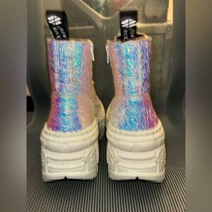 Size 40 EU, will fit a US 9.5 womens. Amazing crinkle iridescent holo material shifts color depending on how the light hits them. Chunky white platform outsole, lace up front, inside zippers, cool New Rock metal logo plaques on outsole.